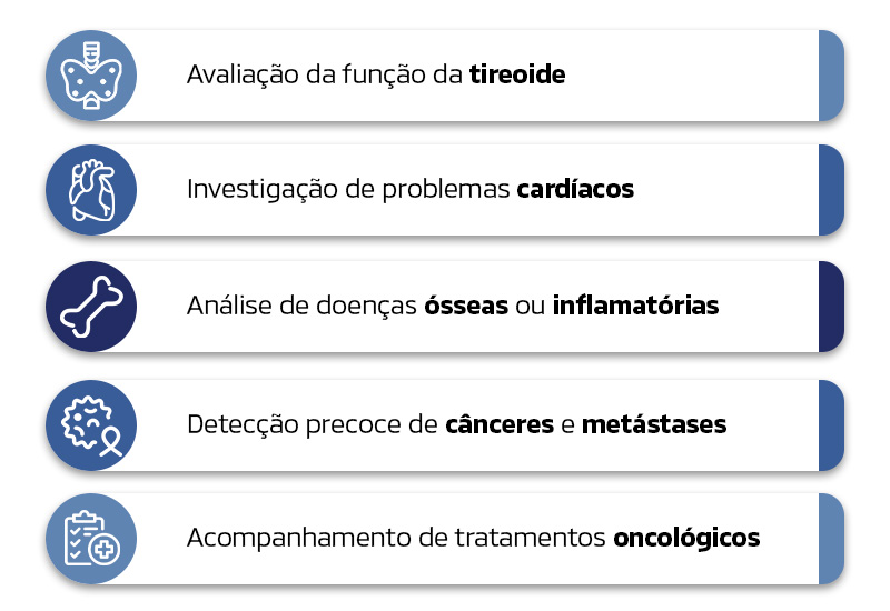 É indicado para avaliar o funcionamento de diferentes órgãos e estruturas, ajudando no diagnóstico de doenças cardíacas, renais, ósseas, tireoidianas, gastroesofágicas e alguns tipos de doenças oncológicas, por exemplo.