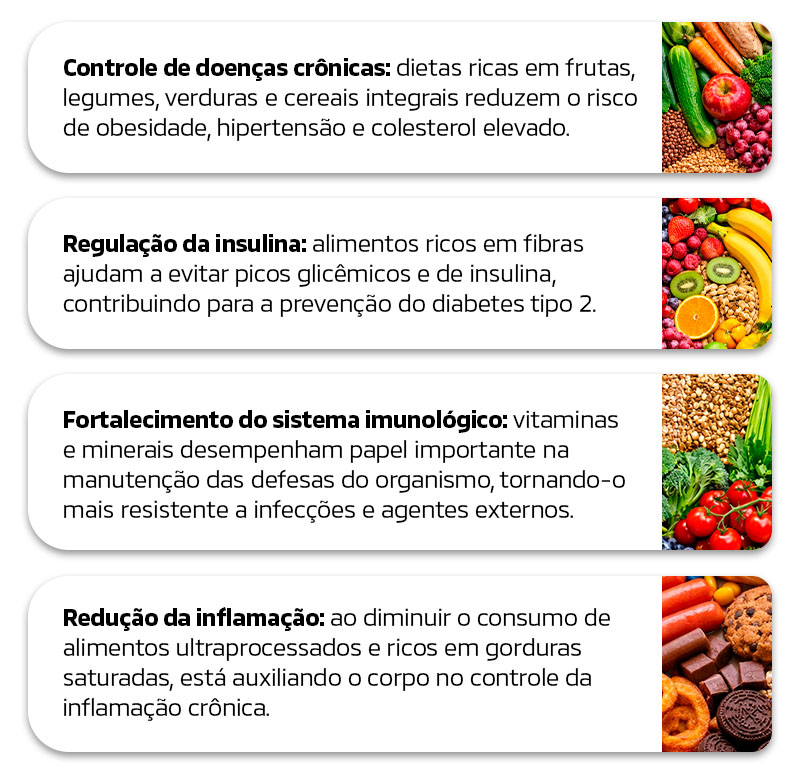 Nesse contexto, uma dieta equilibrada atua como um verdadeiro mecanismo de proteção. Ela auxilia na prevenção de doenças crônicas não transmissíveis, como diabetes, doenças cardiovasculares, obesidade e alguns tipos de câncer.