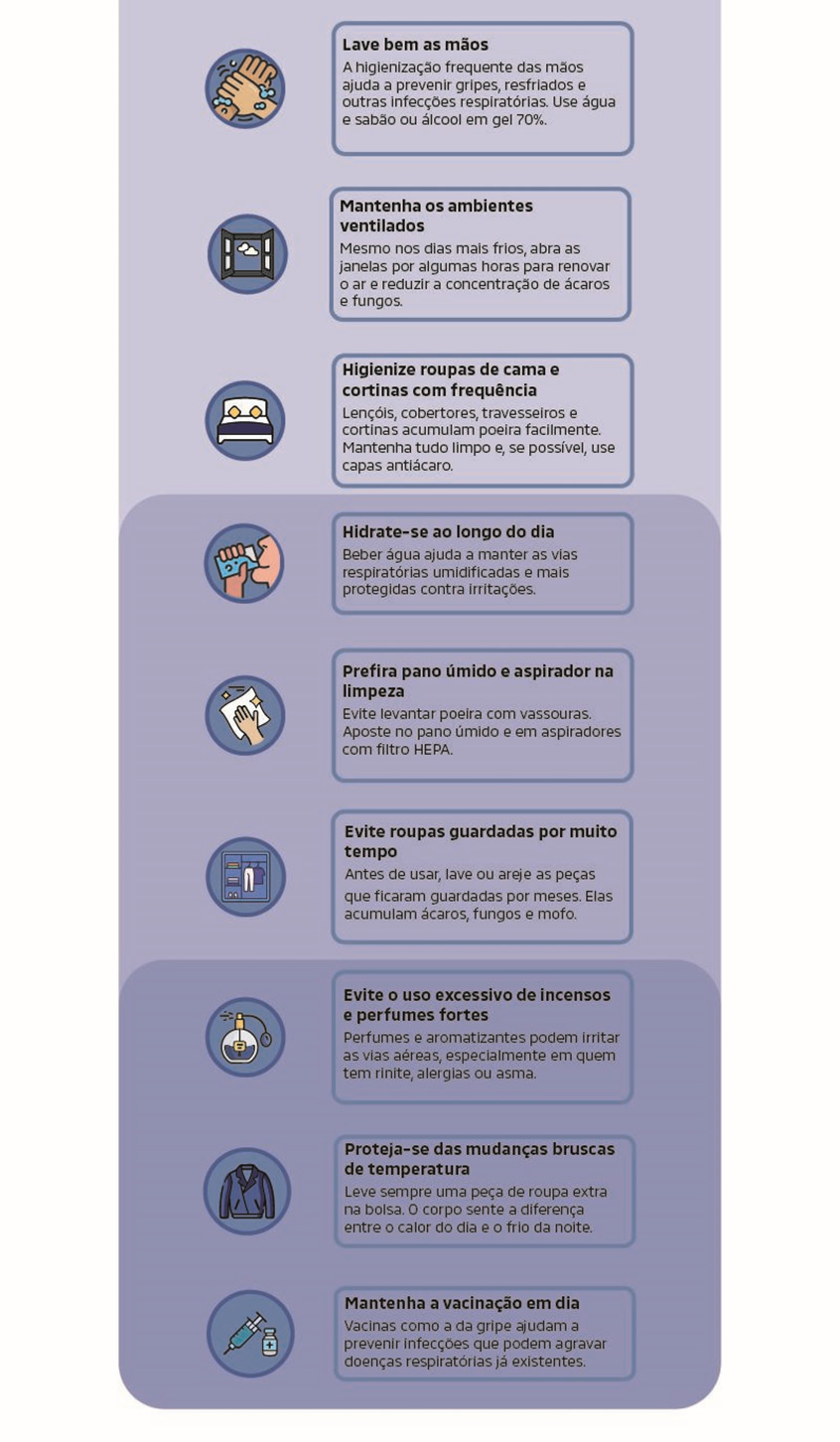 Com o ar mais seco, as variações de temperatura e o aumento da poeira e dos ácaros no ambiente, o sistema respiratório sofre.